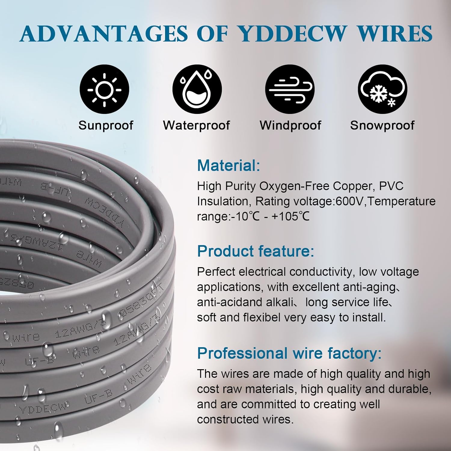 • [Waterproof and Sunproof] - The jacket material of UF-B wire cable is made of high-quality PVC, which is waterproof ,snowproof, windproof, sunproof and durable, can be used in harsh outdoor environments, flexible and durable, with a smooth surface and easy to use, and won't affect the use of the cable in humid environments
