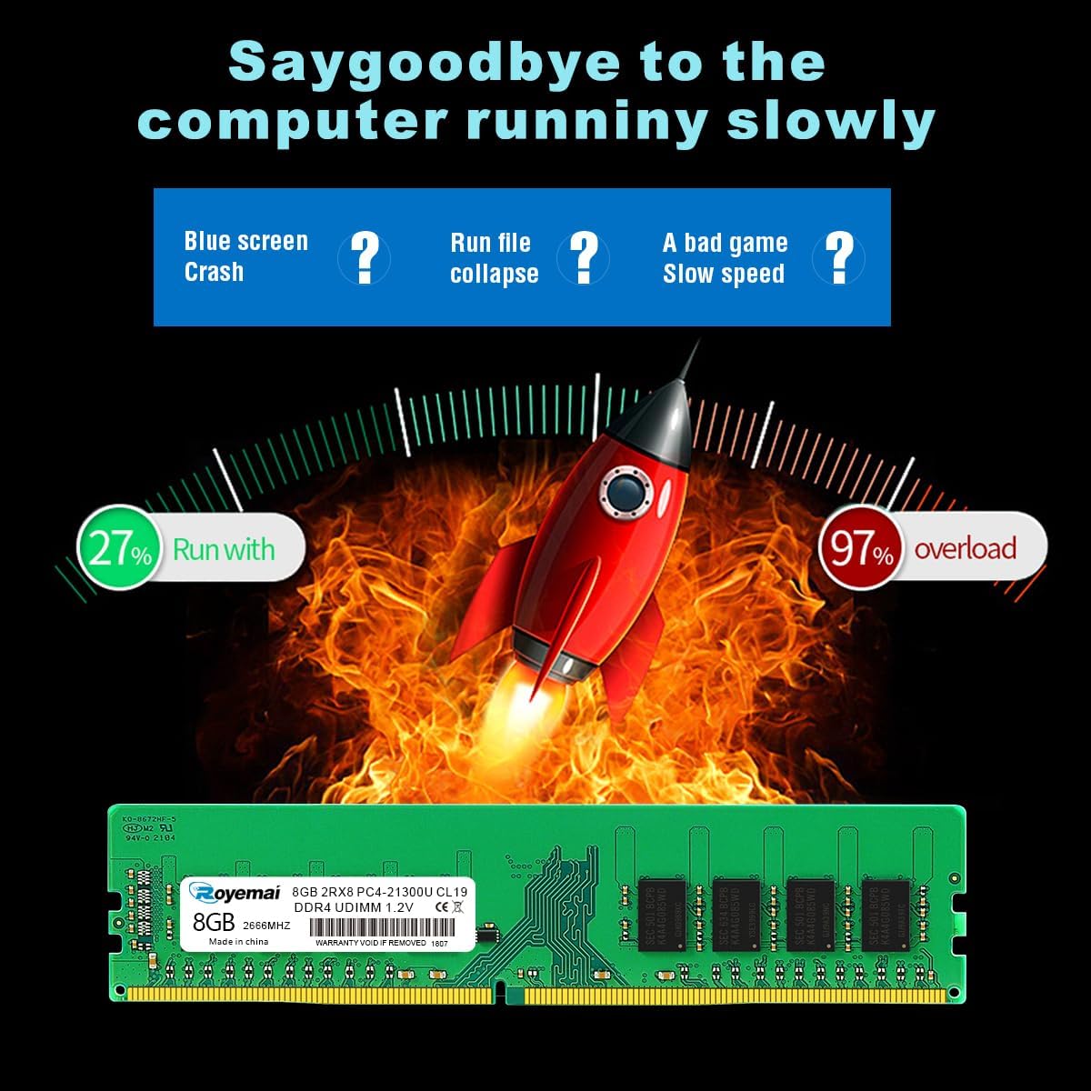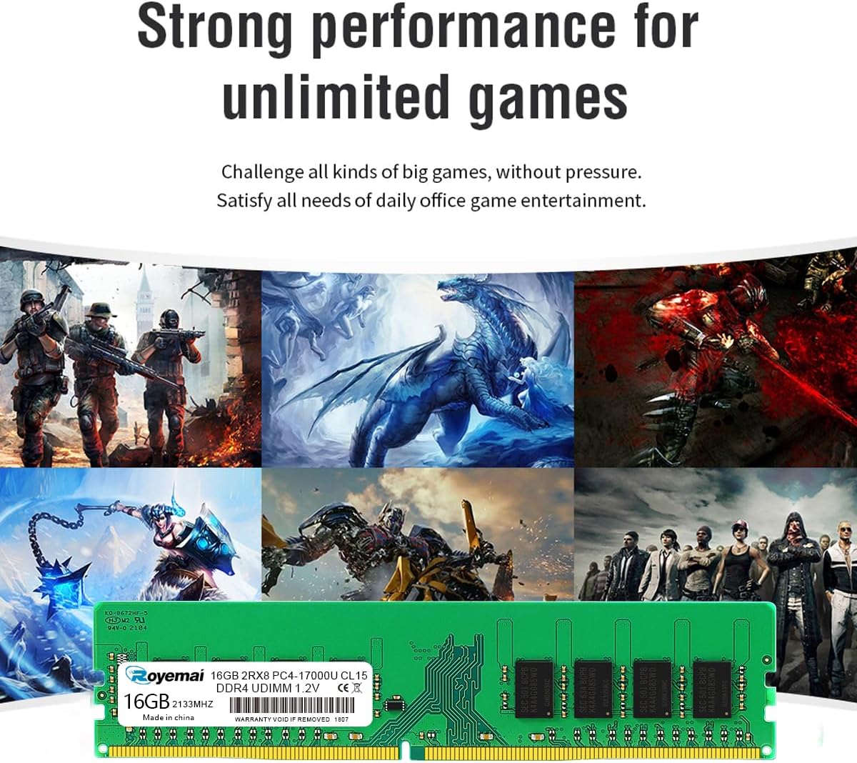 32GB PC4-25600 DDR4 3200 32GB (2x16GB) RAM PC4 25600U 3200MHZ 1Rx8 288-pin 1.2v 32G Memory Upgrade for DesktopPlease Kindly Note: In case the RAM cannot fit your computer, please ensure the parameters before you purchase, such as the RAM model, RAM slot and maximum memory of your computer. High Stability High-quality originals, strict process. All chips from large brands, through strict testing and screening testing. Advanced electroplating process is applied on the connecting finger will improve corrosion resistance and electrical conductivity. After Long-time burn in test and temperature tolerance test aiming at major system platform, it approves that ROYEMAI memory owns high stability and performance. Faster and Smoother ROYEMAI RAM is designed to help your system run faster and smoother, one of the easiest ways to improve your system's performance. Load programs faster, increase responsiveness, run data-intensive applications easily and increase your desktop's multitasking capabilities. After install larger memory, computer will respond noticeably faster, particularly with lots of windows open. High Compatibility To make sure it’ll be compatible with Intel, AMD System well, ROYEMAI RAM has been through compatibility testing with all popular brands of motherboards. Test results show that memory is able to offer superior performance and high stability required during long time operation for any brand computer. Common Fault Diagnosis 1. Turn on computer, no display ☛ Please try to wipe the connection figure with eraser, don’t use Corrosives, such as ethyl alcohol. 2. Windows often boot into safe mode automatically ☛ Please try to slow the speed of data read in CMOS setting. 3. Computer crash randomly ☛ Please try to slow the speed of data read in CMOS setting. If don’t work, use same frequency RAMS.
