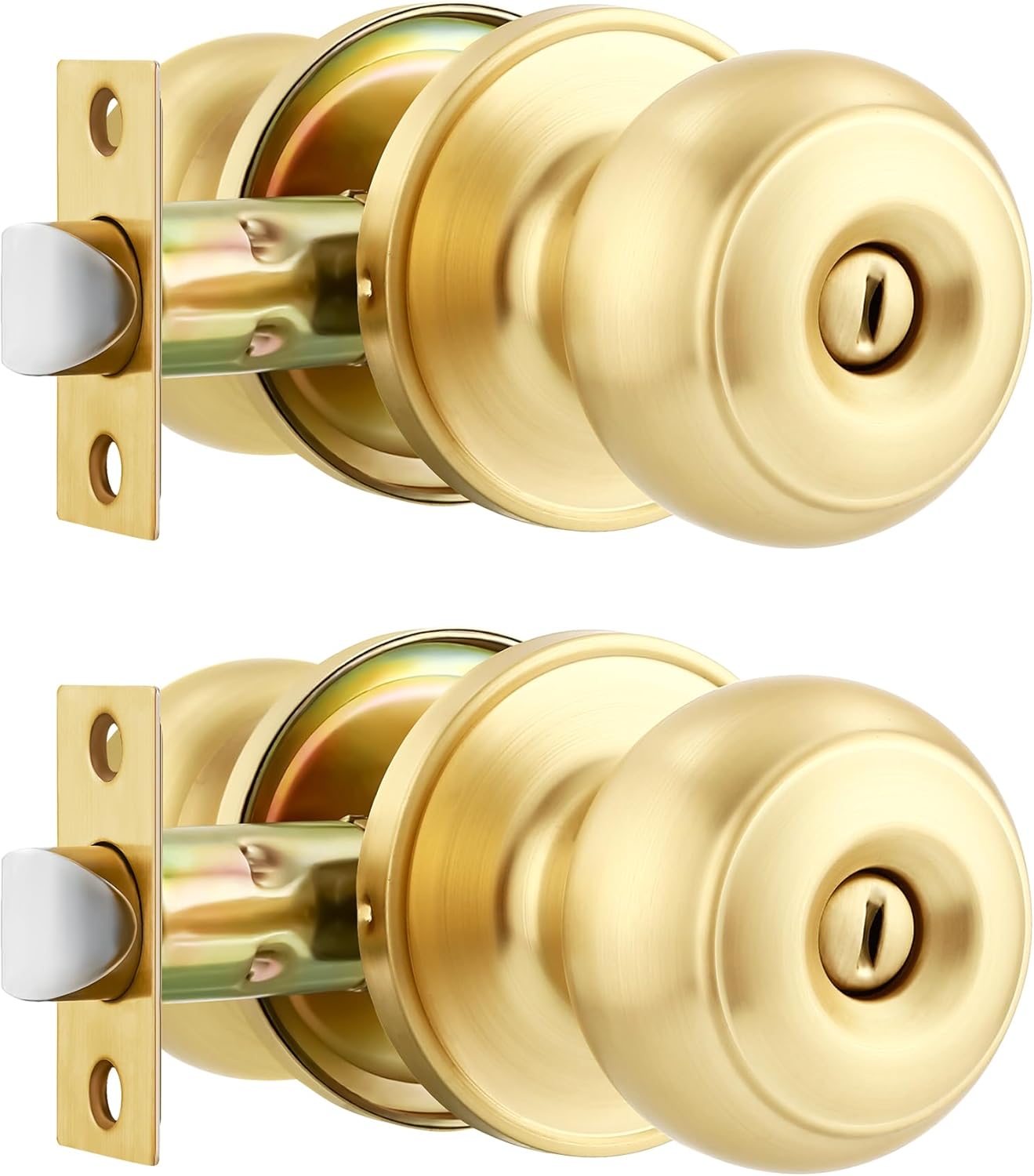 • Passage door knobs Satin Brass Finish.Body Material:Stainless Steel. Fits both right handed and left handed doors.Classic gold door knob with flat ball and round rosette.