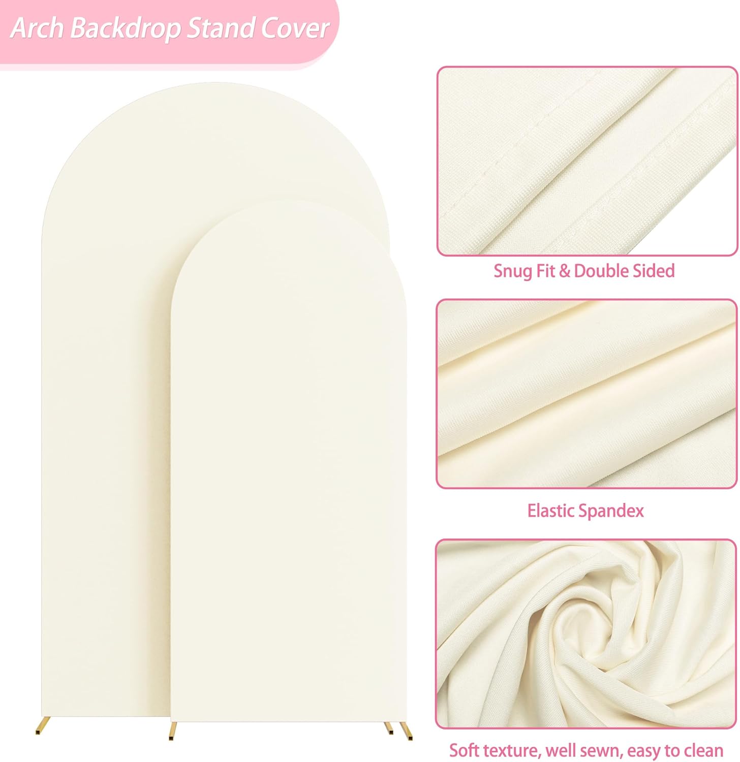 • 【Double-sided Arch Covers】Cover material: Spandex. Color: Pink. Size: 7.2ftx4ft & 6.6ftx3.3ft & 6ftx2.6ft (HxW). The 2-sided backdrop stand cover makes your wedding decoration appear more stunning and ethereal from any perspective. The wedding arch will look very neat from both sides. And the cover adopts a pullover style, which is convenient to use.(Notice: arch frame not included)