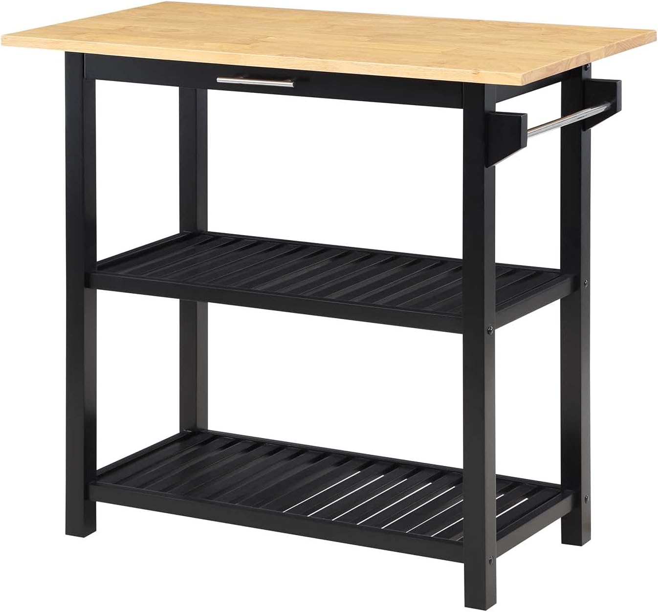The Designs2Go 3 Tier Butcher Block Kitchen Prep Island with Drawer by Convenience Concepts combines style and smarts all in one. Expand your countertop space and make dinner preparation even easier by displaying this stationary island in the center of your kitchen. The smooth butcher block countertop offers a sleek and stylish station to assist with your cooking needs. When not in use, utilize this functional piece as a microwave cart, coffee bar station, or mini fridge stand. Two additional slatted shelves have the option to be used as wine bottle storage or for larger kitchen essentials. A stainless-steel towel holder and one spacious drawer on smooth roller slides offer easy access to smaller utensils. Practically maintenance-free, this kitchen island is finely crafted from solid wood and finished in non-lead-based paint. Perfect for small kitchens, apartments, and anywhere you might need a little extra storage or kitchen prep space. Keep your space effortlessly organized by adding the eye-catching Designs2Go 3 Tier Butcher Block Kitchen Prep Island with Drawer from Convenience Concepts.