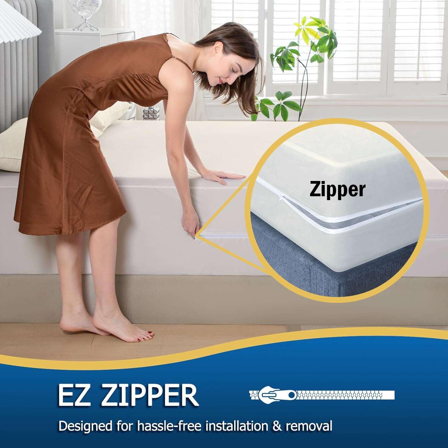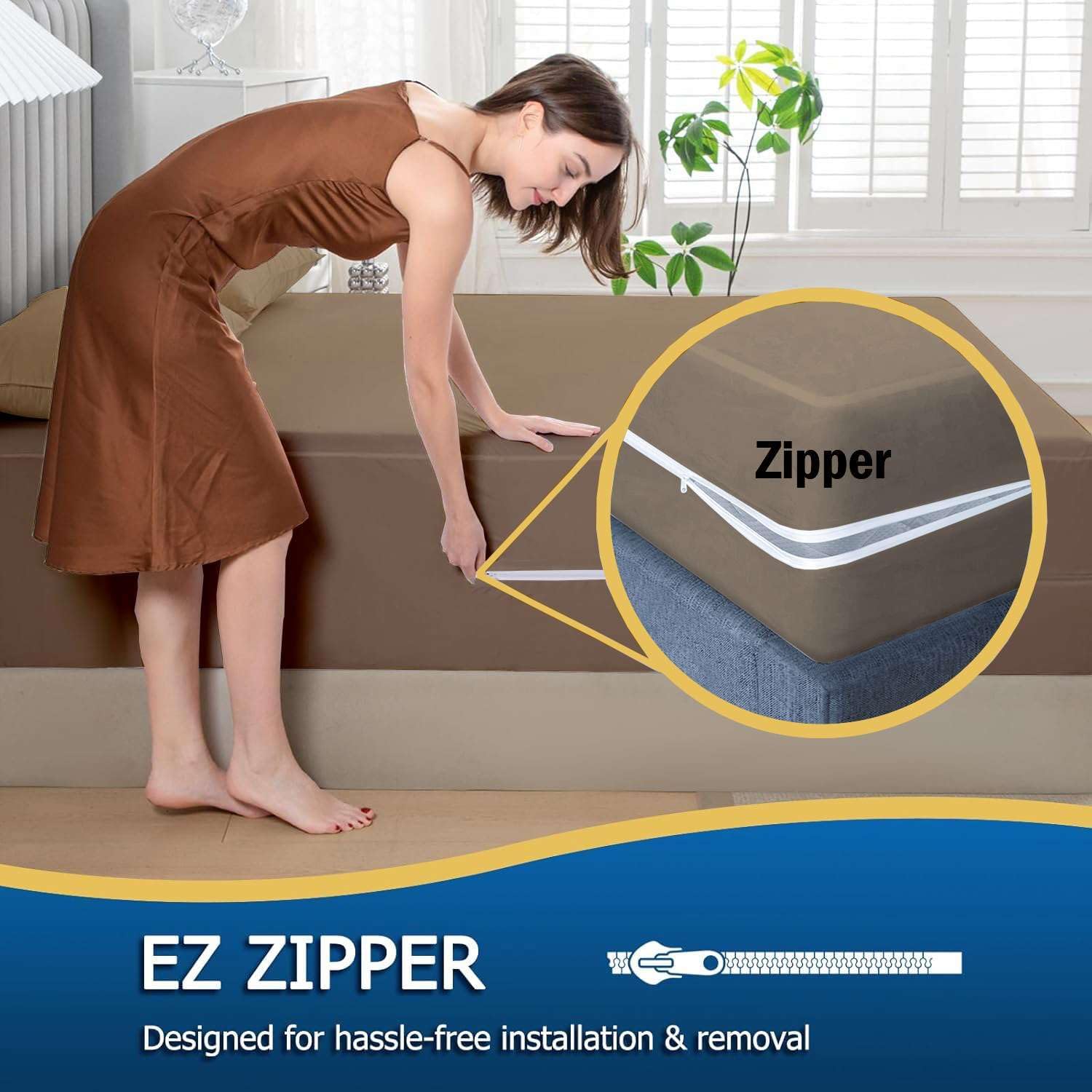 Transform your sleep experience with our 100% Microfiber Zipper Fitted Sheet, expertly designed to provide ultimate comfort, convenience, and style. Crafted from premium quality microfiber, this sheet offers an exceptionally soft and smooth texture, ensuring a luxurious feel every night.SECURE ZIPPER CLOSUREThe innovative zipper closure ensures your fitted sheet stays securely in place throughout the night. Say goodbye to frustrating slipping and bunching—this zipper design keeps your sheet neatly fitted, providing a smooth and wrinkle-free sleeping surface. It also makes changing your sheets a breeze, simplifying your bed-making routine and laundry tasks.ENHANCED COMFORTOur lightweight microfiber sheet provides a silky-smooth surface that enhances your comfort and sleep quality. The fabric is soft and gentle on the skin, offering a cozy and restful night’s sleep.VERSATILE DESIGNAvailable in multiple sizes, including king, queen, twin, full, and California king, our fitted sheet is designed to fit different bed dimensions perfectly. Choose from a range of colors to match any bedroom decor, allowing you to customize your bedding look to suit your personal style.Upgrade your bedding with our 100% Microfiber Zipper Fitted Sheet and enjoy the perfect blend of luxury, convenience, and durability. Sleep better and wake up refreshed with this high-quality, easy-care fitted sheet designed to meet all your needs.