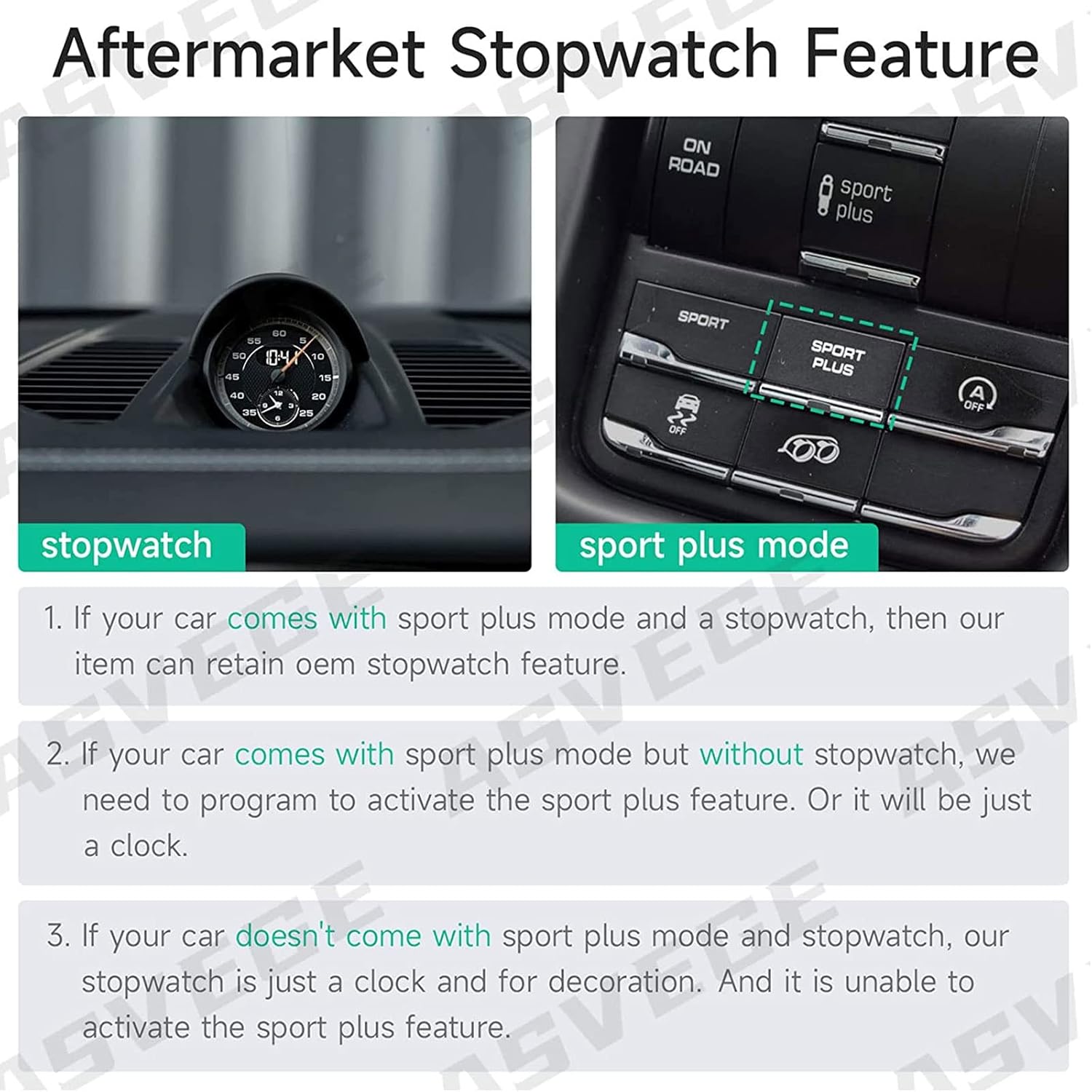 Dashboard Clock Compass Time Electronic Meter Clock,Instrument Dashboard Panel Upper Cover Trim with Clock for Porsche Cayenne 2011-2017If your car have Sport Chrono, Please let us know, We Will Make Chrono Function To Your Stopwatch**Tip: Please Let us know what Clock Color do you need when you orderFor Porsche Cayenee 2011-2017 Car Stopwatch Dashboard**Color: 1:Black Panel and Black Clock;2,Black Panel and white Clock;3:Black Panel and red Clock; 4:Black Panel and yellowClockFeature1. Specific for Porsche Cayenne 958 92A 2011 2012 2013 2014 2015 2016 20172. Function as a clock. And also for decoration3. Made of high‑quality ABS, anti-corrosion, wear resistance, sturdy, not easy cracked4. Molded from original car parts, factory fitted5. Easy to self install, plug and play6. If your car has sport chrono function, you may contact us for a software upgrade.Packing List1x dashboard panel cover1x stopwatch1x harnessNote:Please leave your first name and last name for shipping purpose.Any other questions ,fell free to contact us