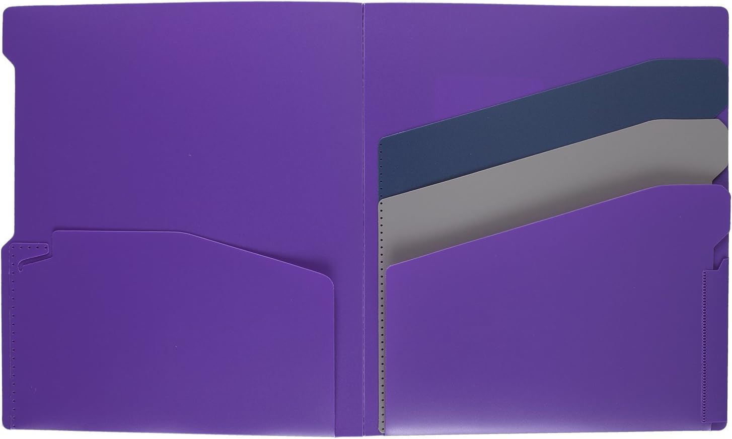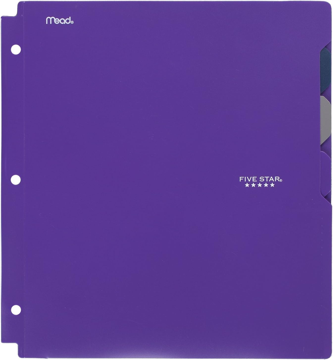 Keep school paperwork neat, tidy and easy to get to with these Five Star plastic folders. The folders include 3 Quick-View tabs to navigate between subjects quickly and easily. The tabs are multicolored and visible while the folder is closed to color-code, identify, and access different subjects. The 4-pocket design offers more storage space. Inside the folder 1 horizontal pocket is on the left, with three layered pockets on the right side for multiple organization options. This Five Star four pocket folder holds letter size sheets and is 3-hole punched for convenient storage in a ring binder. Durable plastic construction lasts all year. Four pack of assorted trend colors.