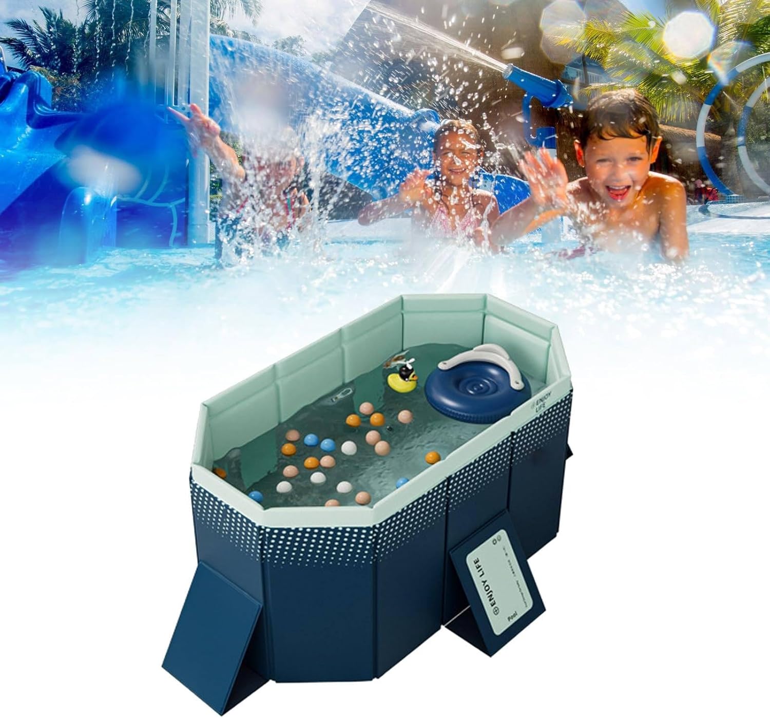 Made of environmentally friendly PVC and environmentally friendly composite reinforced sheet, combined with wrapped edges, the bathtub is strong and long-term use. So get ready for an exciting summer adventure and make a splash with the inflatable pool!【FUNCTIONALITY】:1.Foldable design makes it simple to open and fold, space-saving for home storage and easy to store and carry, outdoors or traveling. (DRY BEFORE STORING)2.The built-in drainage hole is designed with a spiral, which can be rotated and opened for easy drainage. In addition, it can also be drained by an external water pipe to irrigate flowers and plants, effectively utilizing water resources3.The swimming pool adopts non-slip bottom design, Protect your family or pets while bathing or playing【SPECIFICATION】:Name: Folding Swimming PoolMaterial: PVC + environmentally friendly composite reinforced sheet.Color bluePool shape: square shapeSize :1.6m: 160*120*47cm; suitable for 1-2 people1.85m: 185*138*53cm; suitable for 1 to 3 people2.1m: 210*140*55cm; suitable for 1 to 4 people2.6m: 260*165*55cm; suitable for 1 to 6 people3m: 295*165*55cm; suitable for 1 to 8 people4m: 406 x 230 x 55cm; suitable for 1 to 12 peopleApplication: garden, party; children, adults, pets, families, friends; sand, balls, toys or water.【PACKING LIST】:1x foldable swimming pool10 x ocean ball1 x repair kits❤If you have any questions, please contact us and we will respond to you within 24 hours. ❤