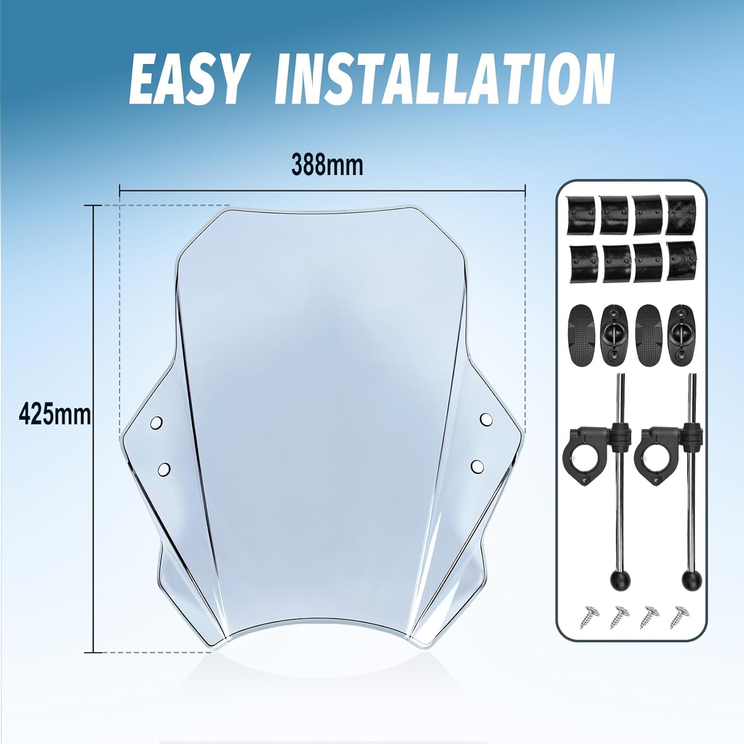 Included Components 1 Piece Windshield Deflector, 1 Set Mounting Bracket (left & right), 1 Set Mounting Hardware Screw Kit
