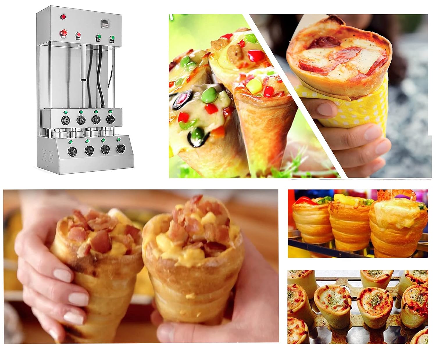 Pizza cone machine 4 cone maker with oven machine NOTE: This price include 2 sets machine:pizza cone maker and oven Pizza Cone Machine Introduction 1.The new type pizza cones owns good appearance, and is as delicious as the traditional pizza. 2. It is easy to be made, without hiring professional cook, saving lots of cost. Thus, the price of it becomes more acceptable to many people 3. Also, the pizza cone could be hold in hand as the ice cream.It is fast and convenient food easy to take. Pizza Cone Machine Main Features 1. Equipped with automatic alarm, could adjust temperature according to different recipe. 2. Soft pizza cone making machine is suitable for restaurant, cake room, bakery, drink store, cafe etc. 3.This soft pizza cone machine is made of food grade stainless steel, safe and healthy Pizza Cone Machine Specification Pizza cone machine Dimension:530*350*980mm Voltage:220v 110v Power:2600w Electric currency:12A Machine weight:45kg Pizza oven Dimension:820*440*530mm Voltage:220v 110v Power:2000w Electric currency:10A Machine weight:40kg