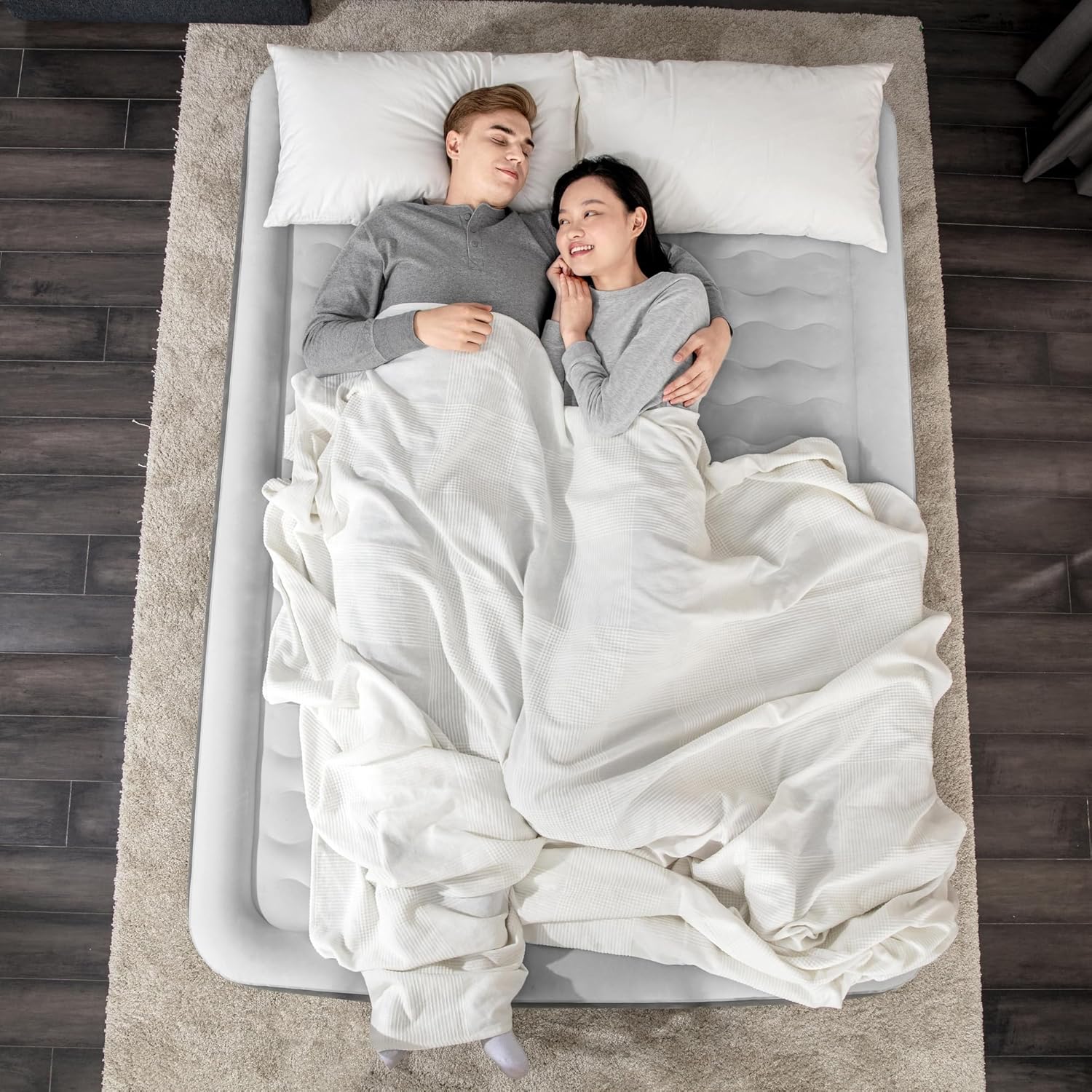ALWAYZAIRE: TOUGH GUARD AIRBED - QUEEN 18" BUILT-IN DUAL PUMP - AlwayzAire 18" Tough Guard Airbed Queen with built-in dual pump for a restful night's sleep. SUPERIOR DURABILITY: Tough Guard exterior is 150x more abrasion resistant, 92% more stretch resistant and 75% more puncture resistant than PVC. COMFORT & SUPPORT: Equipped with a luxurious wave beam design, this mattress provides an even and supportive sleeping surface. The surrounding frame design prevents roll-off and ensures comfort throughout the night. BUILT-IN DUAL PUMP: 110-120V AlwayzAire dual pump inflates the bed in 4 minutes. Internal sensors silently reinflate the bed to maintain the intended air pressure throughout the night (must be plugged in all night for dual pump to function properly). ANTIMICROBIAL TREATMENT: With Ultra-Fresh antimicrobial protection, the airbed resists the growth of odor-causing bacteria, mold, and mildew, keeping your sleeping surface clean and fresh for longer use. OVERVIEW: Designed for indoor use. Comfortable flocked sleeping surface. Surrounding frame design prevents roll-off and increases comfort. 2-way interlocking quick release valve for fast, easy inflation & deflation. USB port for phone or tablet charging.
