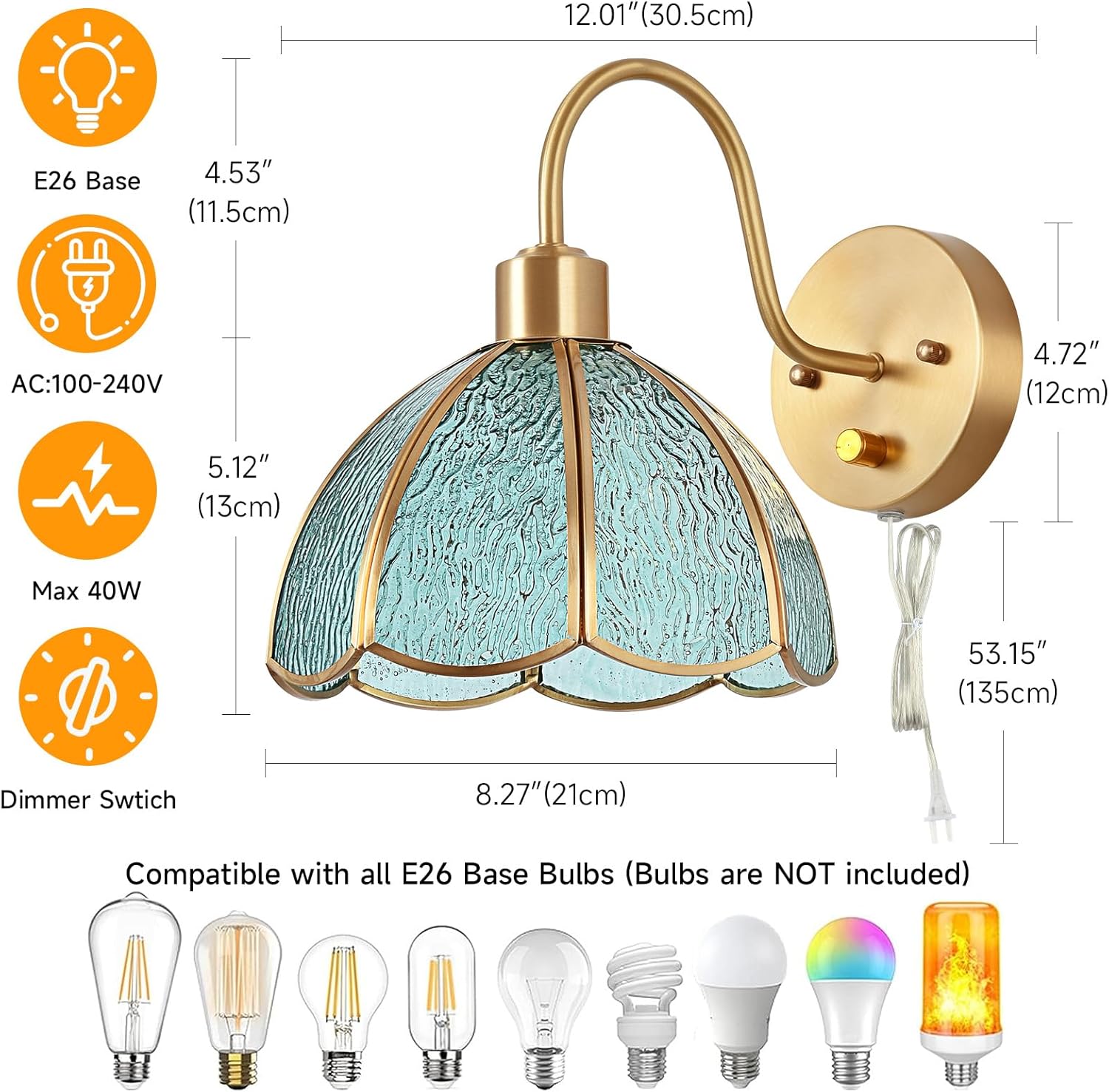 • PARAMETER&PURPOSE : Vintage wall lamp with 4.9ft silver plug and E26 lamp holder, MAX40W (Bulbs Not Included). Distinctive brass classic look perfect for Bedroom, Living Room, bathroom.