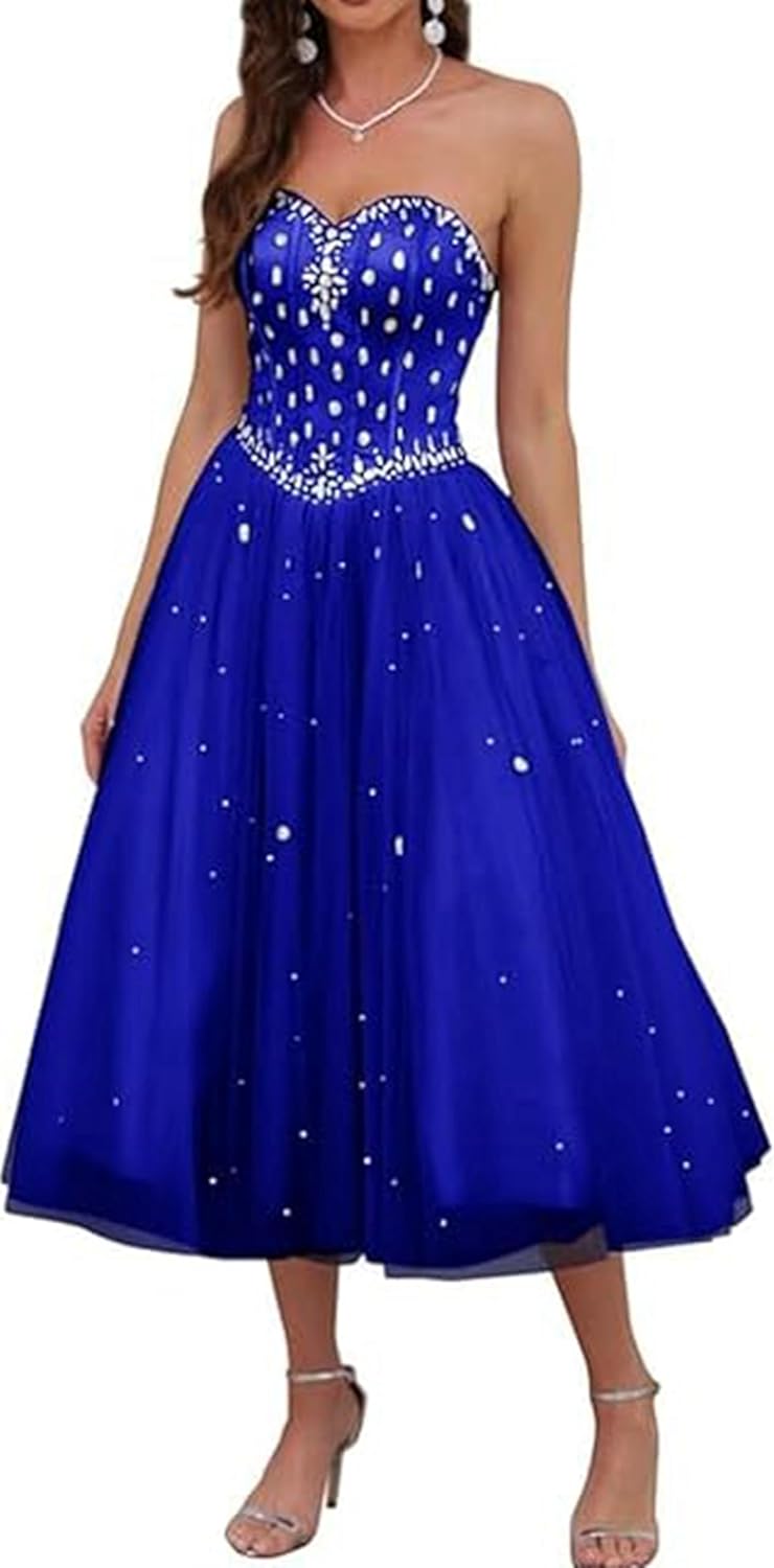 Make a stunning entrance in this enchanting tea-length prom dress in soft lilac purple. The strapless sweetheart neckline and fitted bodice create an elegant silhouette, while the corset-style back with intricate lacing ensures a perfect, adjustable fit. The bodice sparkles with carefully placed crystal beading that catches the light with every movement. The full tulle skirt flows gracefully to a tea length, creating a romantic and sophisticated look perfect for proms, formal events, or special occasions. The combination of the classic ball gown silhouette with the modern tea length makes this dress both timeless and on-trend. The lavender hue is complemented by the iridescent crystals scattered across the bodice, creating a magical effect. The structured bodice provides excellent support, while the layered tulle skirt adds volume and movement. This dress strikes the perfect balance between formal elegance and youthful charm, making it an ideal choice for any special event where you want to make a memorable impression.